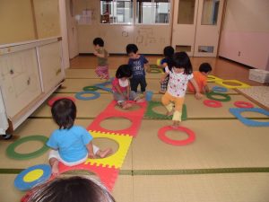 パズルをつなげて、円の中を歩いたり輪っかを転がしてみたり・・・