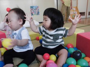 みんな小さい手でカラーボールを持ち、じーっと見つめたり投げたりして楽しみました。