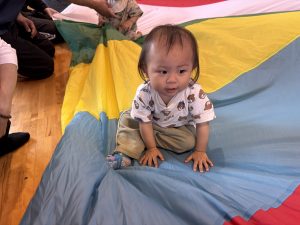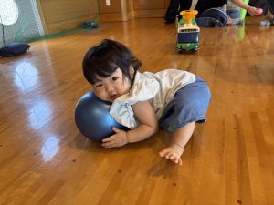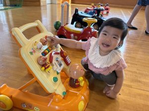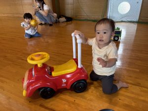 それぞれに好きな玩具を見つけて遊んだり、ホールでは乗り物に乗ったり、ボールで遊んだりしてのびのびと過ごすことができました。